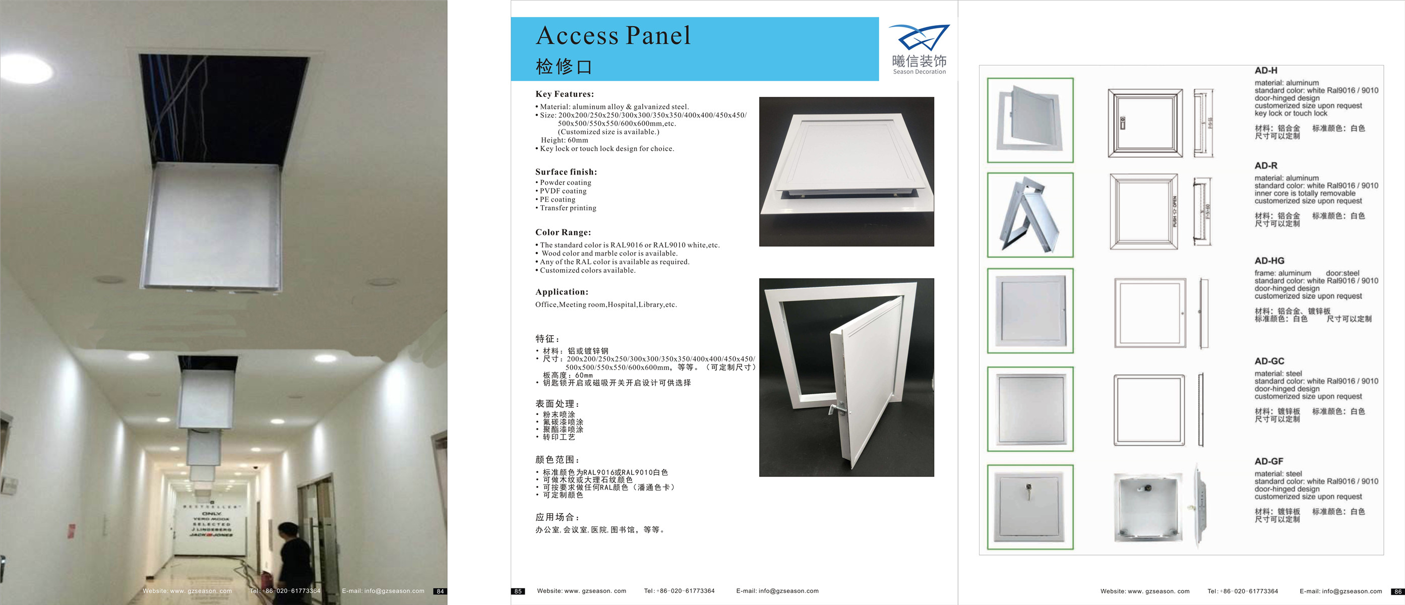 产品描述 产品名称 天花板检修口 材料 铝合金和镀锌钢 颜色 标准颜色为RAL9016或RAL9010白色等。 木色 大理石颜色可提供 任何RAL颜色和定制颜色。 应用场所 办公室,会议室,医院,图书